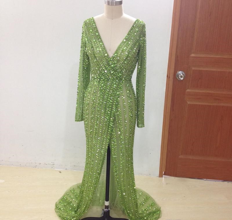 Real Sample Long Sleeve Prom Gown Sexy V Neck Crystal Beaded Sequins Side Slit Formal Dresses Mermaid Long evening Dress