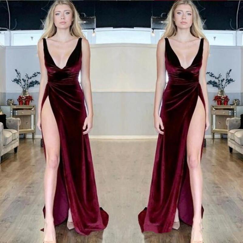 Sexy Women Club Wear Party Gowns High Side Split Long Velvet Prom Dress