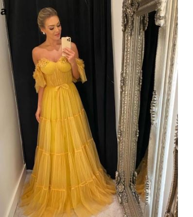 Yellow Sweetheart A-Line Prom Dresses Off the Shoulder 3D Flowers Tiered Tulle Evening Dresses Open Back Formal Prom Gowns