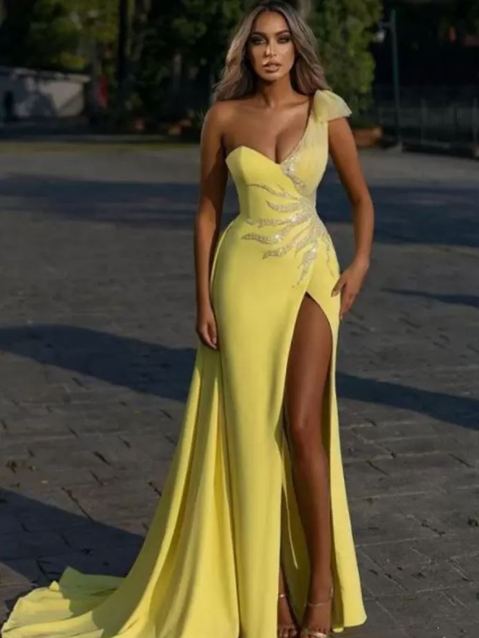 One Shoulder Evening Dresses Front Split Beadeds Sequins Sweep Train Backless Prom Dress