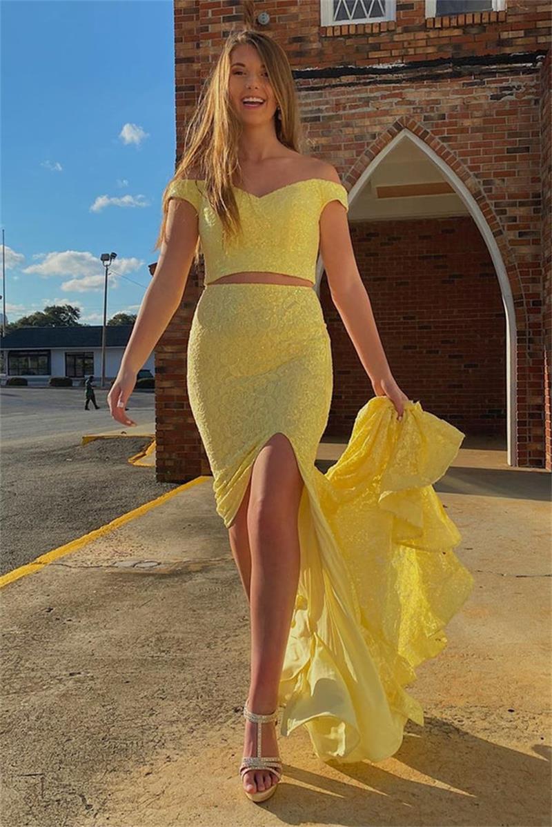 Sheath Two Piece Yellow Lace Evening Dresses Off The Shoulder Side Split Sweep Train Formal Party Prom Gowns