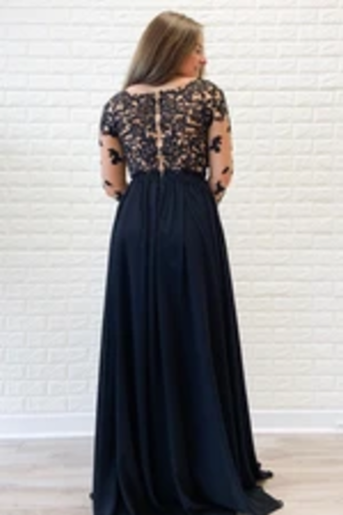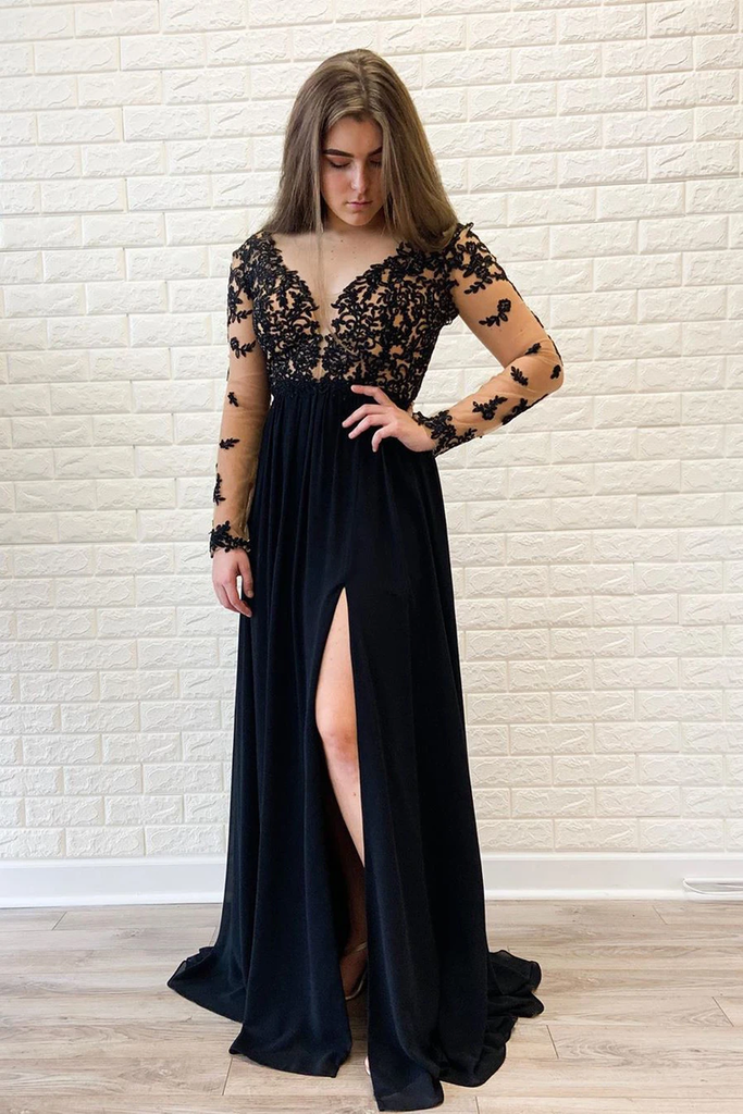 Long Sleeves Black Formal Dress High Slit Sexy Chiffon Long Prom Dress