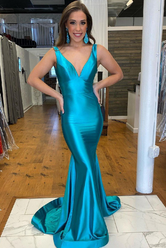 Mermaid Glitter Cyan Satin Backless Prom Dress