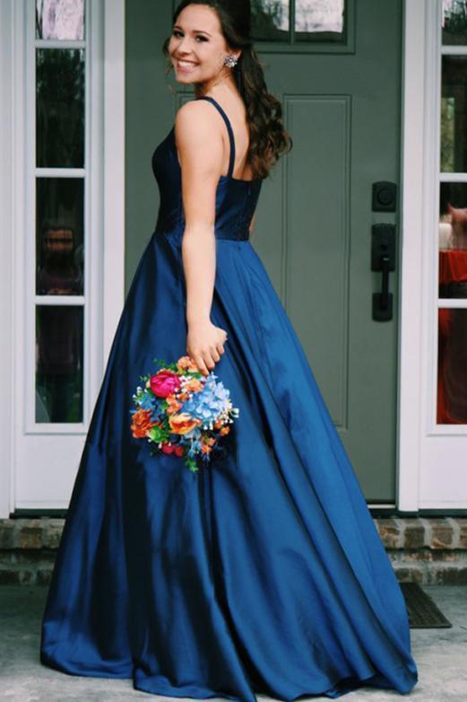 A Line Jewel Sleeveless Prom Dresses Long Cheap Navy Blue Satin Backless Evening Dresses