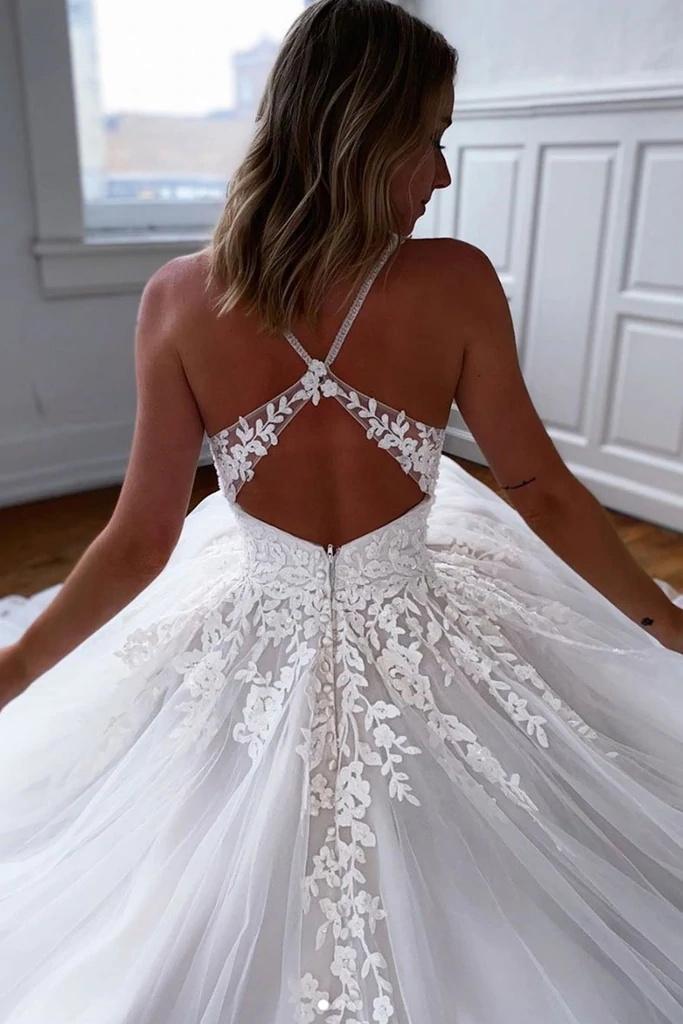 A-line V Neck Lace Appliques Wedding Dresses Spaghetti Backless Sweep Train Bridal Gowns