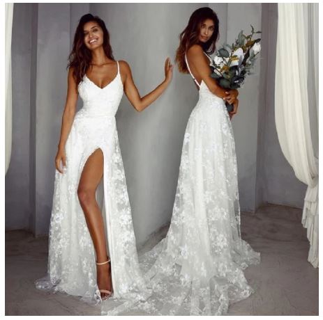 Lace Spaghetti Straps High Slit Wedding Dress Boho A-Line V-Neck Beach Bride Dresses Robe De Soiree Sexy Bridal Gown