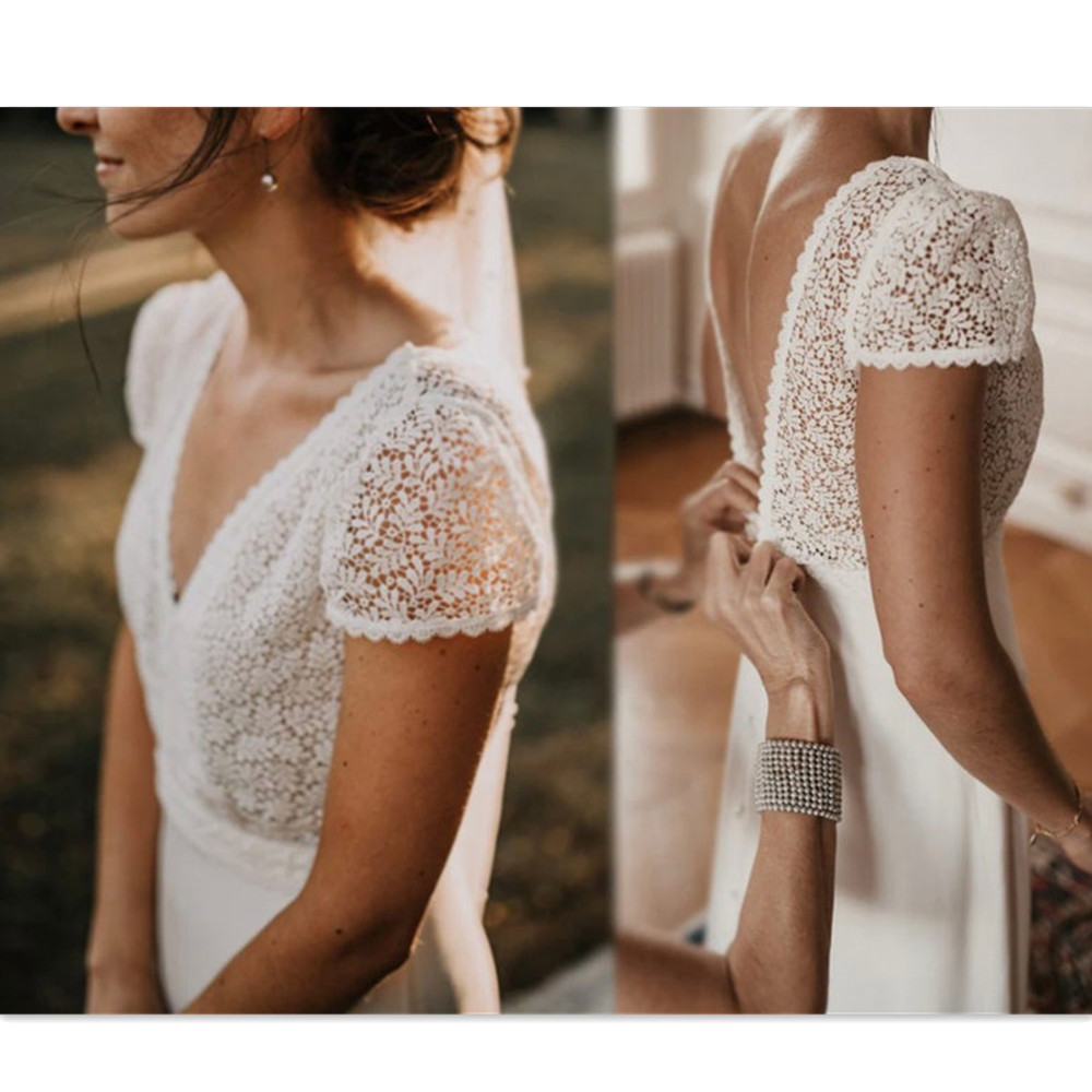 Boho Chiffon Backless Wedding Dress For Women Simple White Bohemian Short Cap Sleeves A Line Beach Bridal Gowns