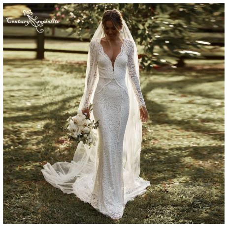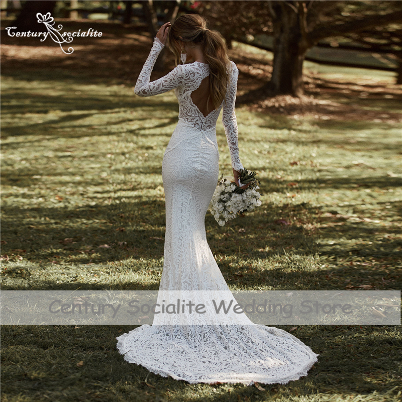 Lace Boho Wedding Dresses Mermaid Bridal Gowns V-Neck Backless Long Sleeve Bohemian Civil Bride Dress
