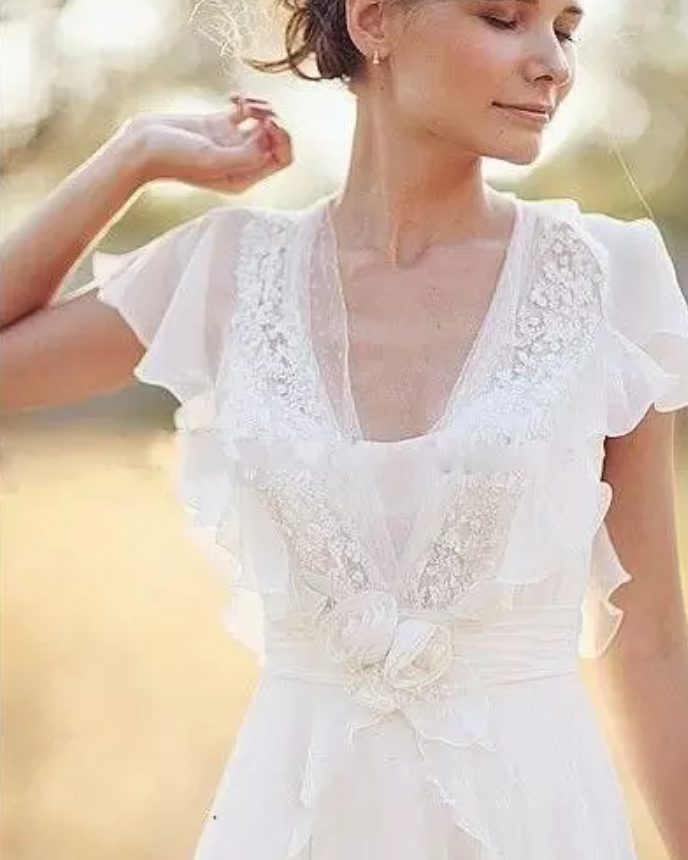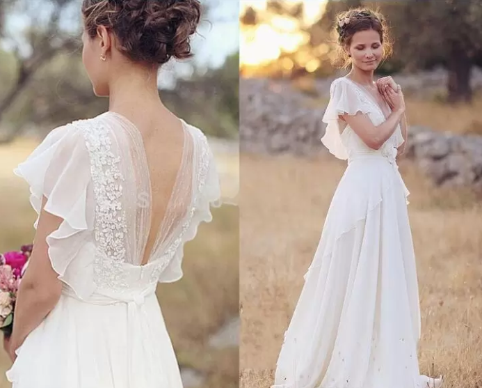 Country Bohemia Summer Beach A Line Wedding Dresses Chiffon V Neck Short Sleeves Open Back Wedding Gowns