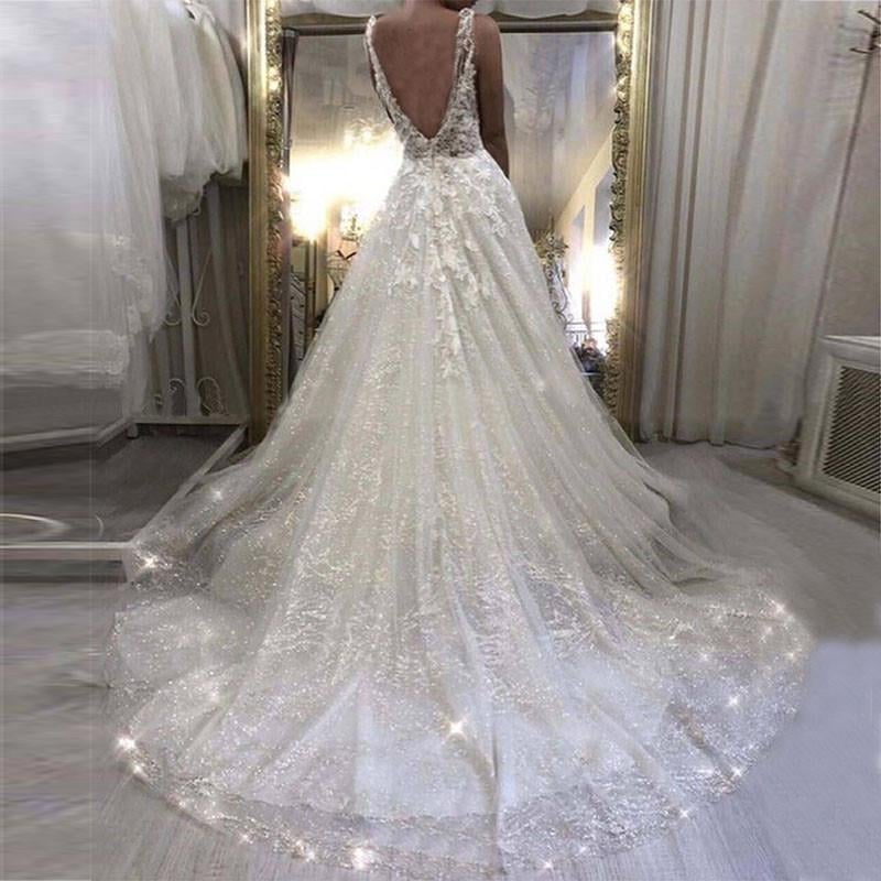 Boho Wedding Dresses Sexy Spaghetti Straps Glitter Sparkle Bride Gowns With Lace Appliques