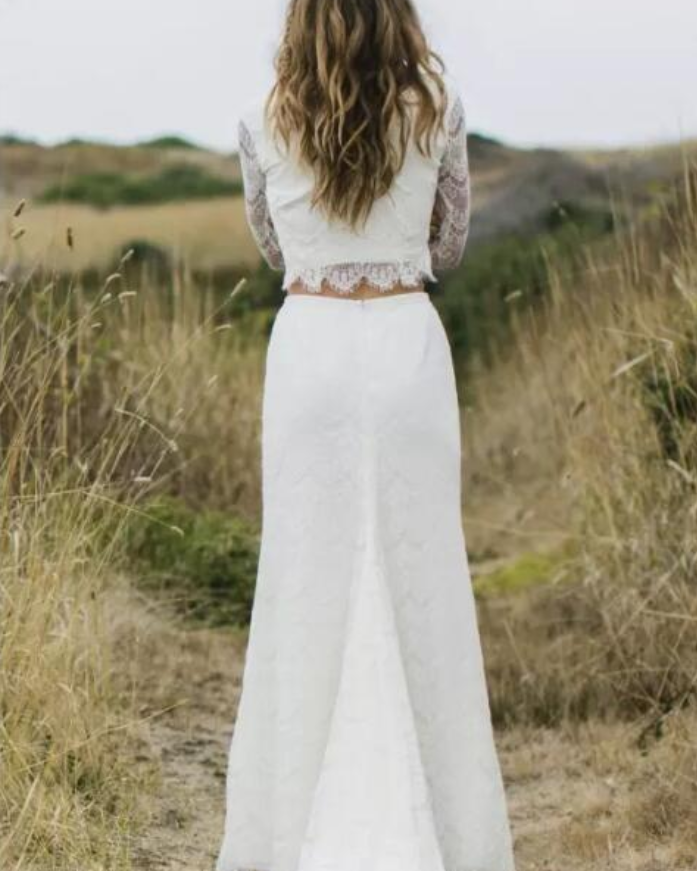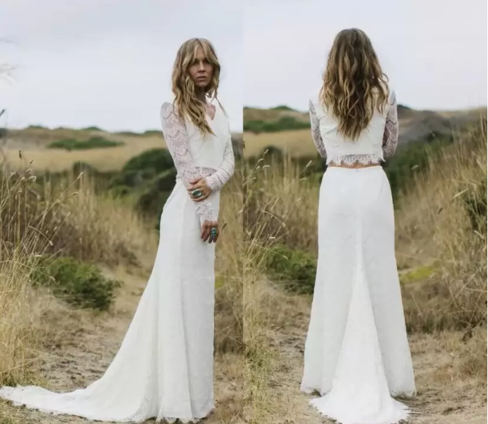 Ivory Two Pieces Wedding Dresses Sheer Long Sleeves V Neck Sheath Boho Wedding Gowns