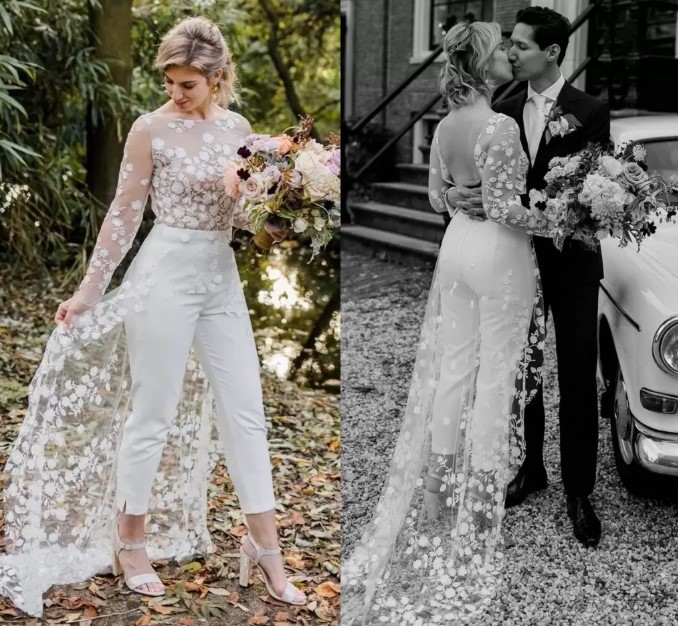 Sexy Open Back Pant Suit Wedding Party Bride Gowns Applique Lace Long Sleeves Wedding Dresses