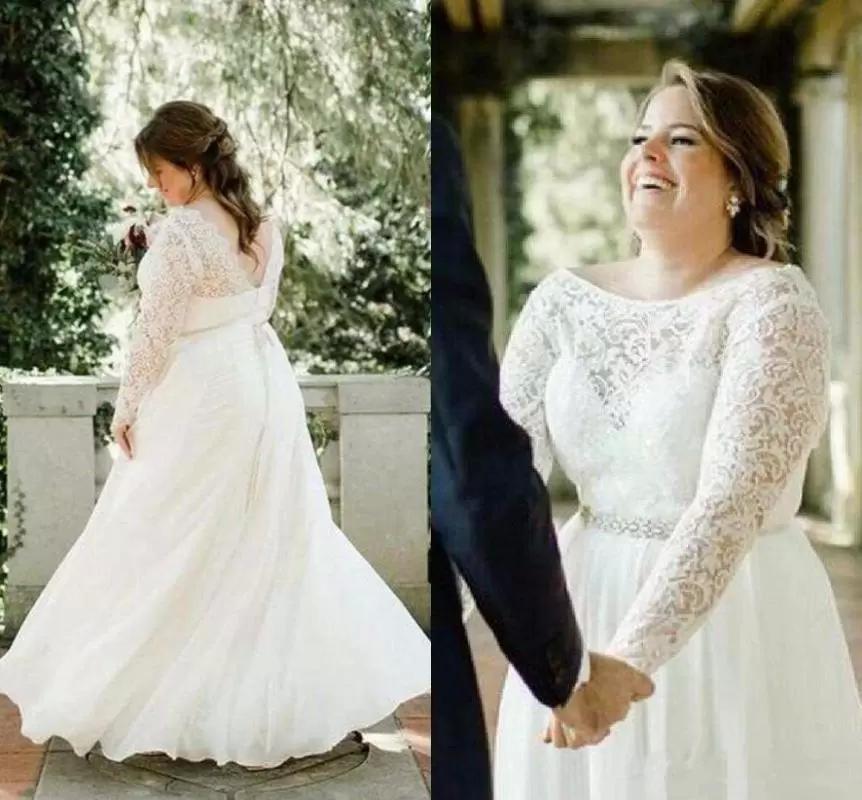 Gorgeous Boho Wedding Dresses Long Sleeves Lace Applique Beaded Waist Chiffon Floor Bridal Gown