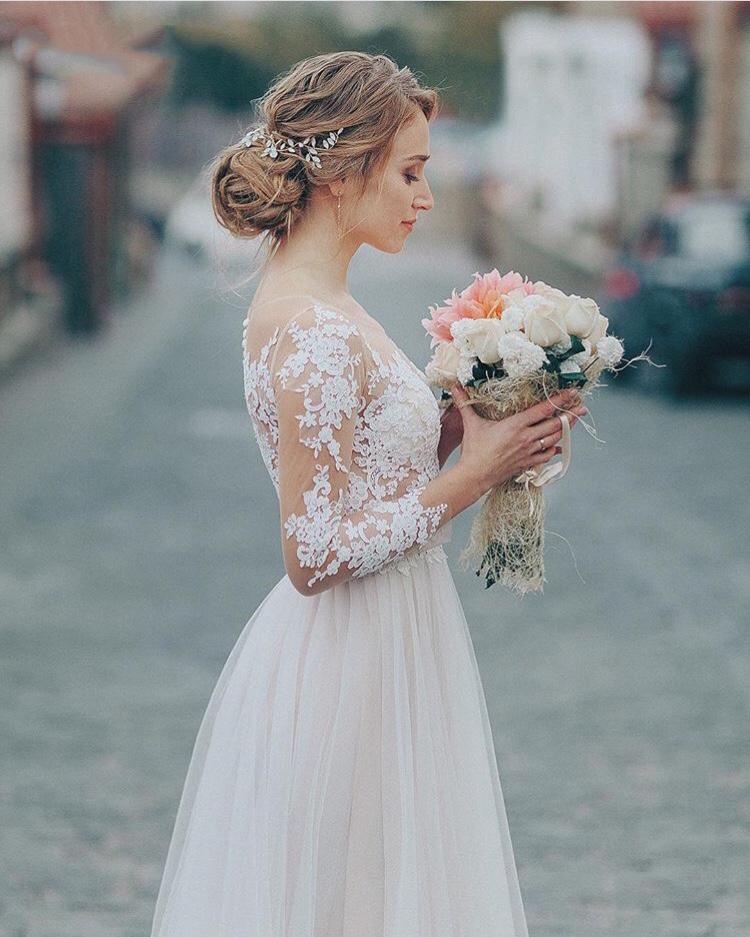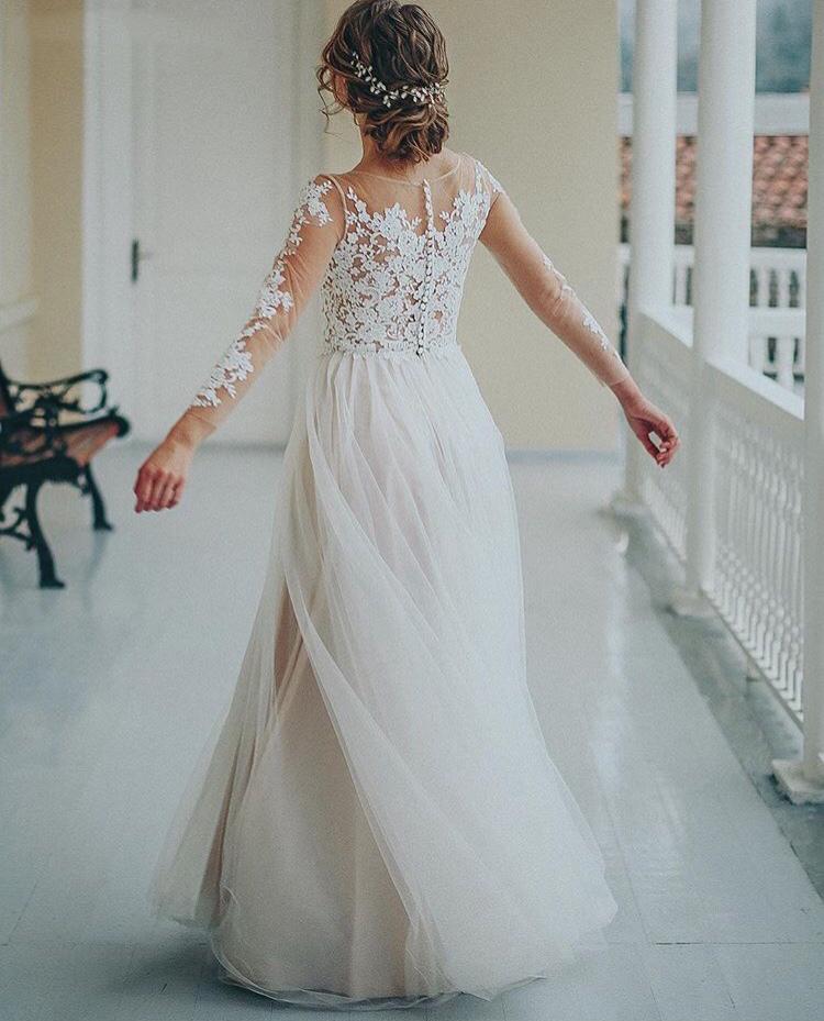Pretty A Line Lace Wedding Dress Boho Beach Garden Bridal Gowns Illusion Long Sleeves Simple Bride Dresses