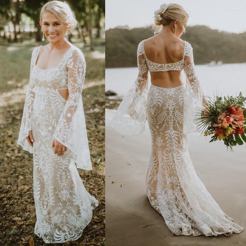 Boho Beach Lace Mermaid Wedding Dresses Long Sleeves Square Neck Hollow Back Custom Made Bridal Gown