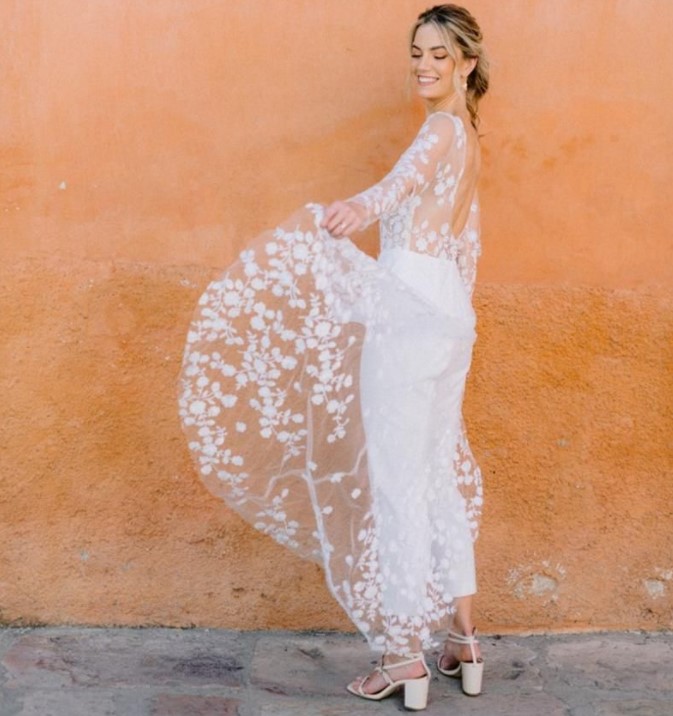Sheath Mermaid Wedding Dresses Jumpsuit Lace Jewel Neck Long Sleeves Backless Floor Length Bridal Gowns