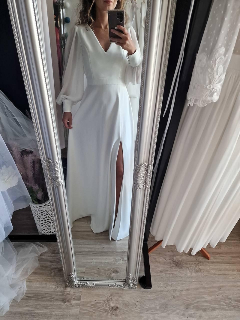 Simple V-neck Sweep Train Lantern Sleeve Wedding Dress Elegant Split Front Backless Zipper A Line Bridal Gown