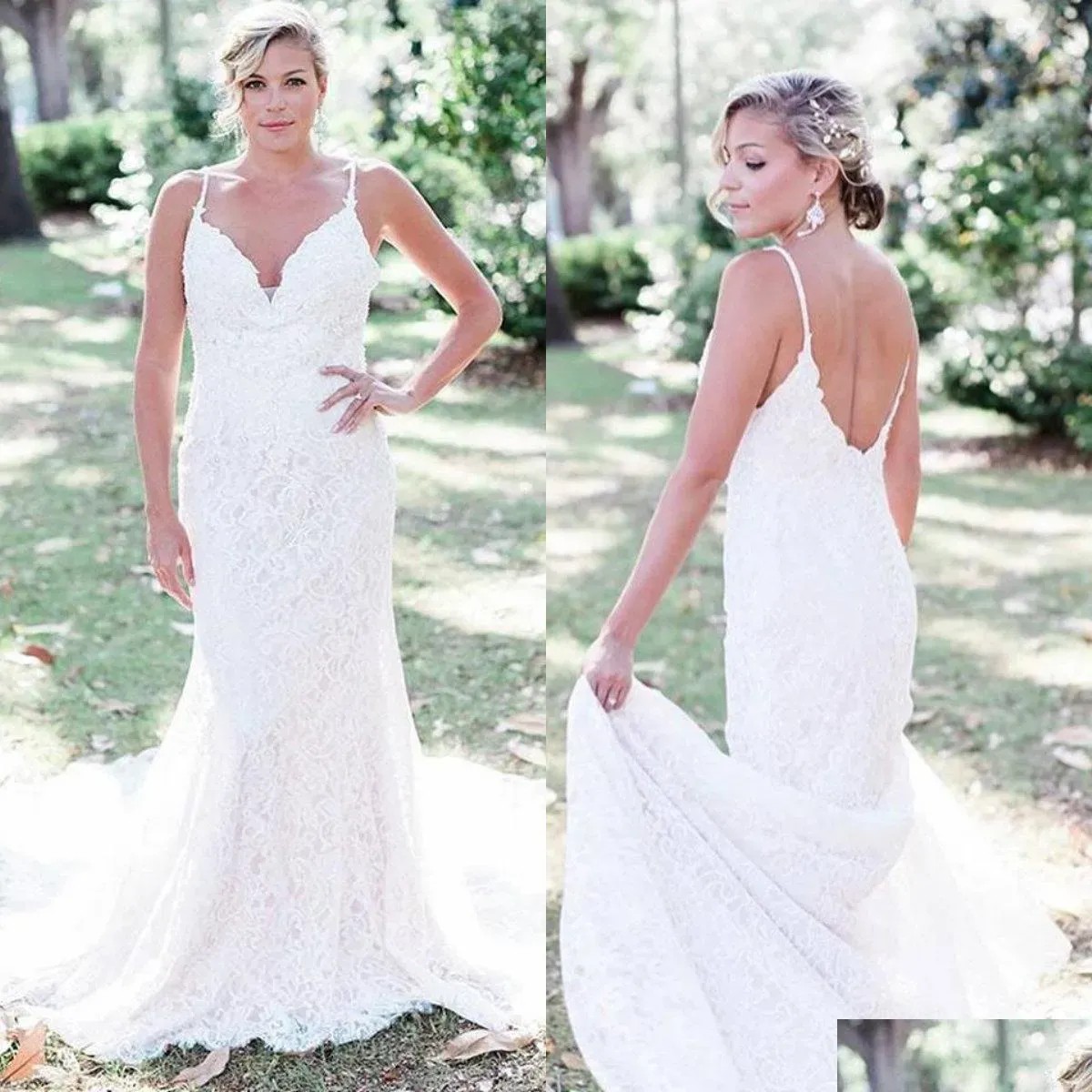 Gorgeous Lace Mermaid Wedding Dresses Bridal Gown Spaghetti Straps Ruffles Satin Sweep Train Custom Made Beach Country Plus Size
