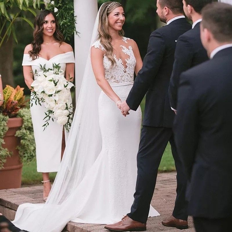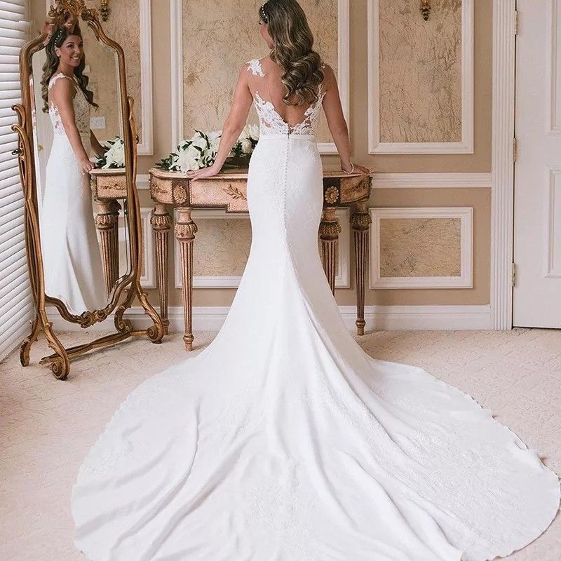 Modern White Elegant Satin Mermaid Wedding Dresses For Brides Lace Appliqued Sheer Neck Boho Garden Bridal Gowns