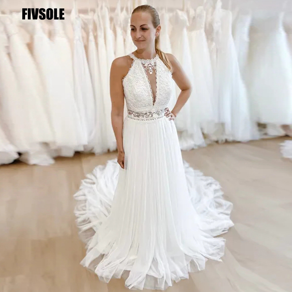 Beach Halter Lace Tulle Wedding Dress For Women 2022 Boho Luxury Crystals Floor Length Sexy Bridal Gowns