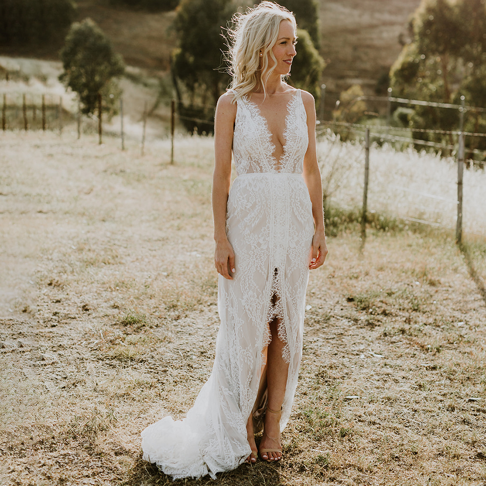 Illusion Tulle V Neck Lace Wedding Dress High Split Leg Opening Backless Beach Boho Sheath Rustic Long Train Bridal Gowns