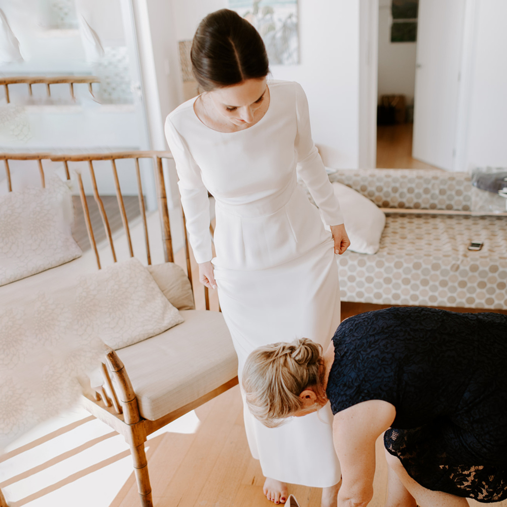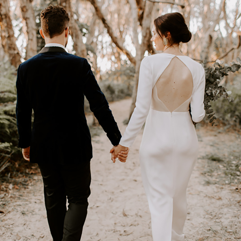 Sheath Crew Neck Simple Long Fitted Sleeves Wedding Dress Pre Order Leg Split Crepe Open Back Custom Made Elegant Bridal Gowns