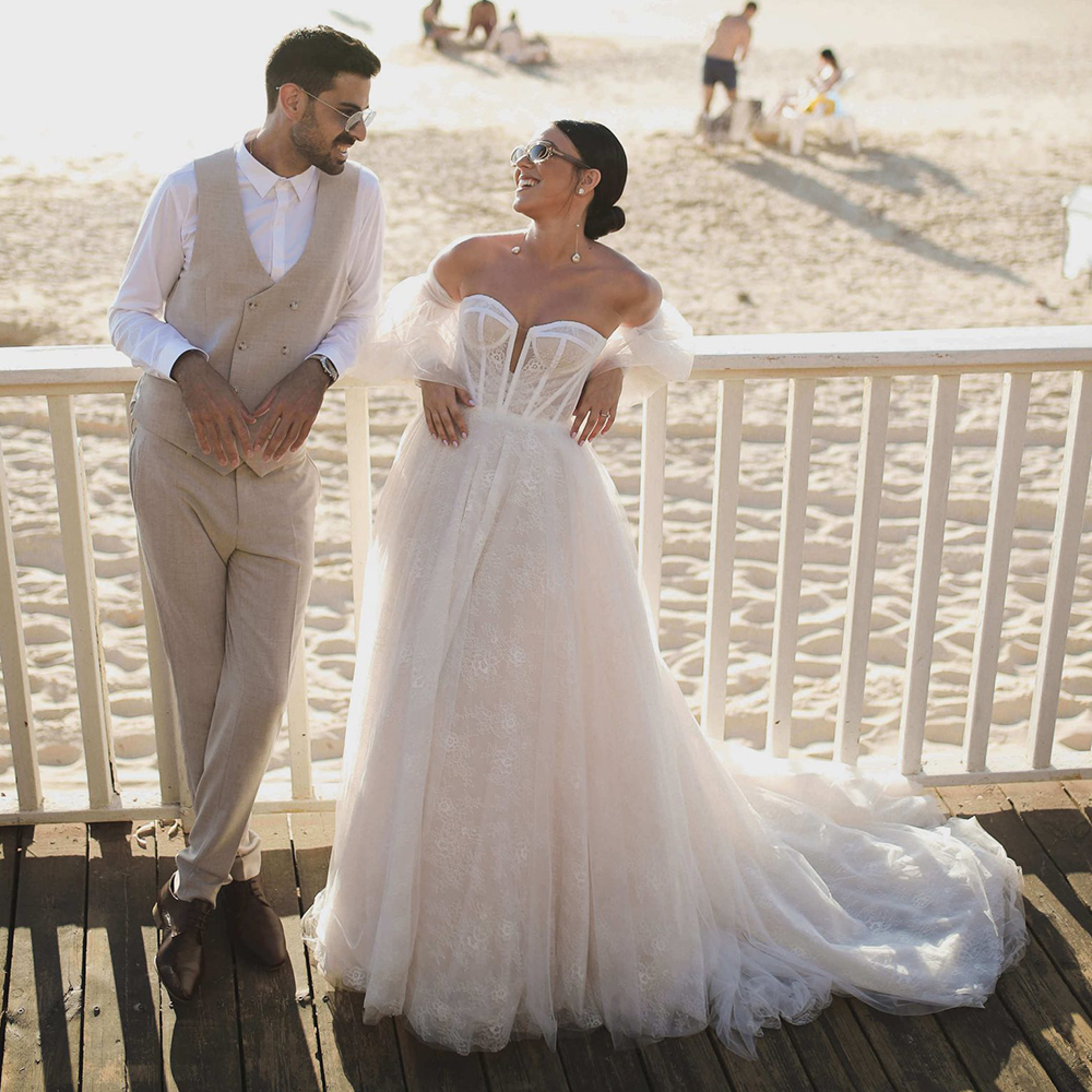 Custom Made Fluffy Tulle Princess Wedding Gowns Luxury Boho Long Bishop Sleeves Corset Lace Off Shoulder Sweetheart Bridal Dress