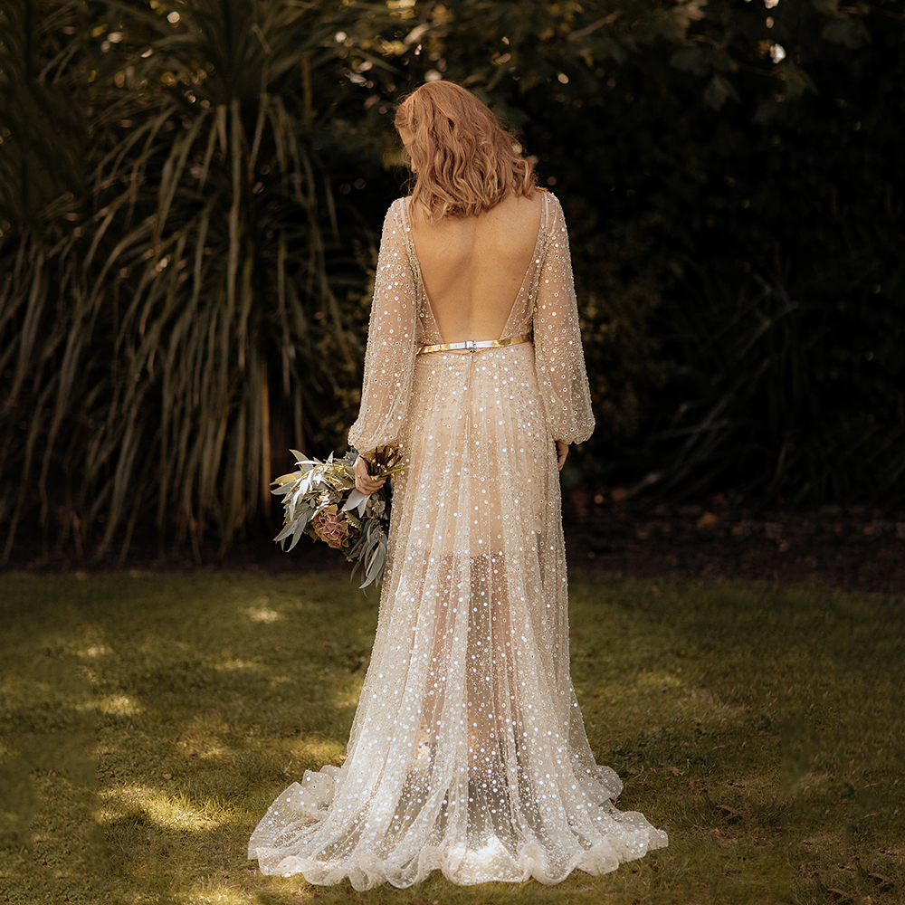 Long Bishop Sleeves Luxury Beading Tulle Wedding Dress Custom Made Backless Sequined A Line V Neck Transparent Skirt Bridal Gown