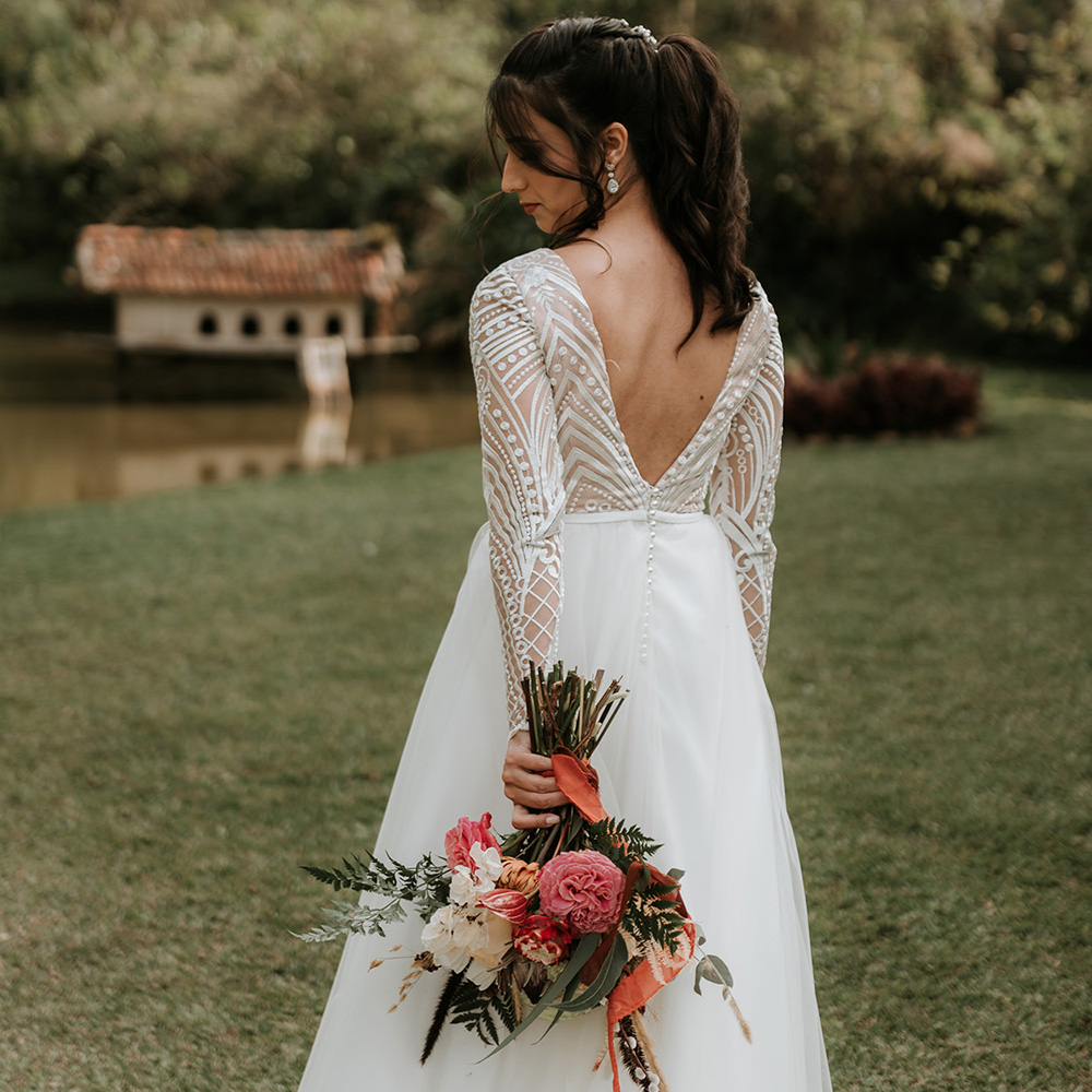 Geometric Lace Rustic Maxi Destination Wedding Dress A Line Custom Made Backless Tulle Long Sleeves Bateau Neck Boho Bridal Gown