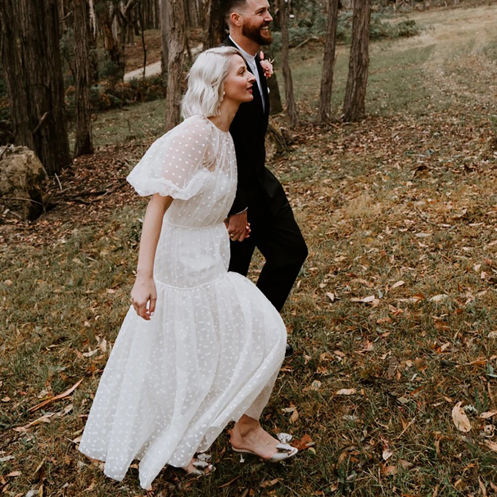 Half Bubble Sleeves Puff Ankle Length Bridal Gowns Illusion Scoop A Line Plumeti Dotted Tulle Lace Up Rustic Boho Wedding Dress
