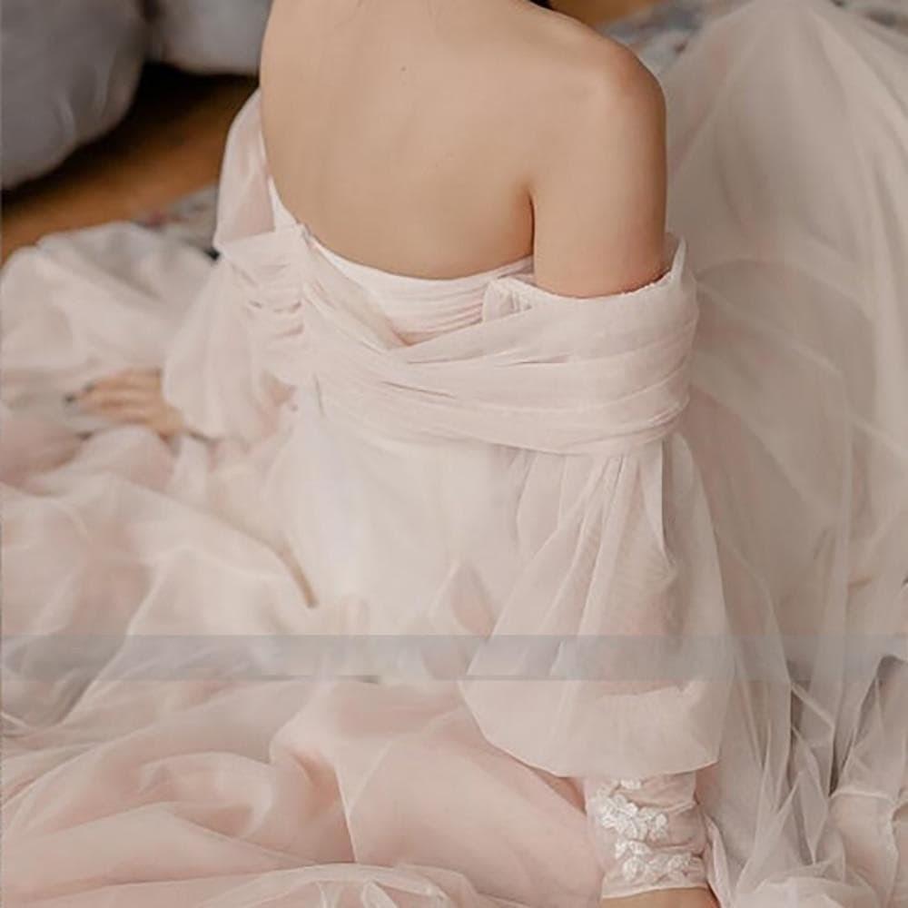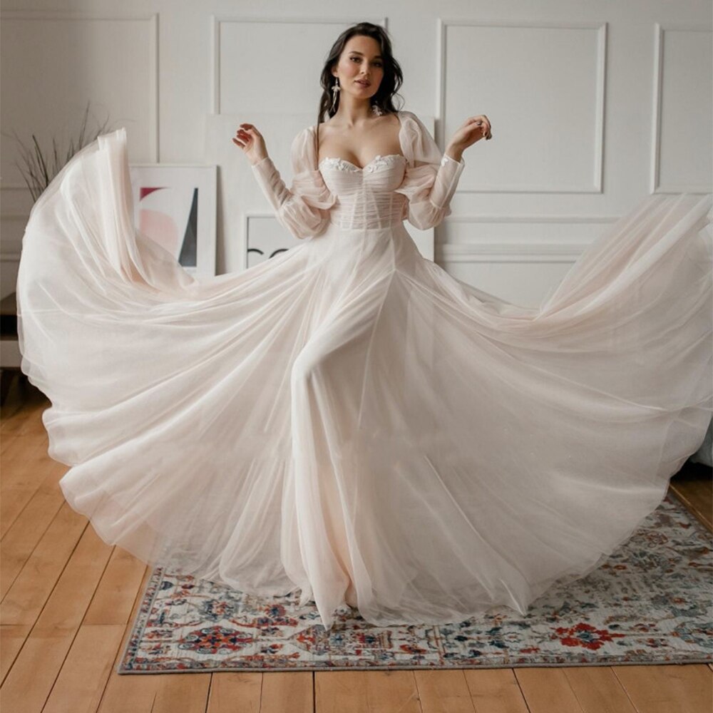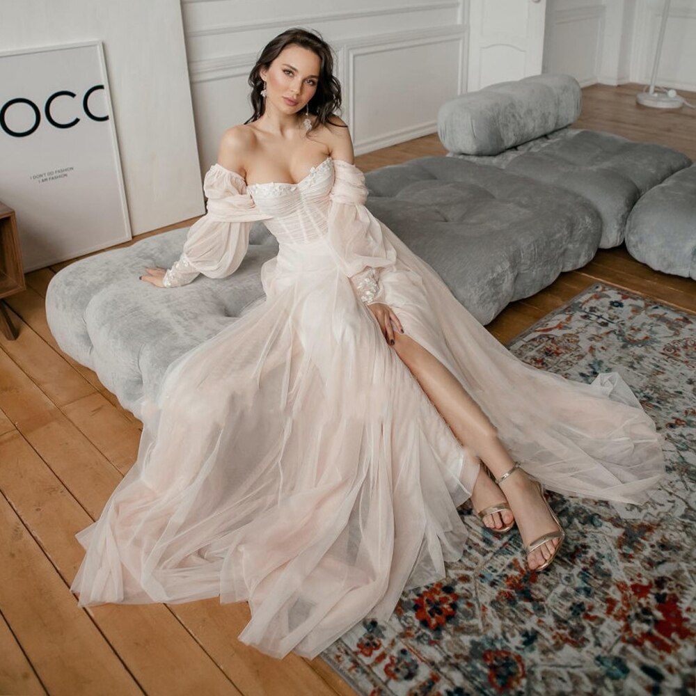 A-line Wedding Dress Appliques Lace Off Shoulder Tulle Low Back Bridal Gown Long Puffy Sleeves