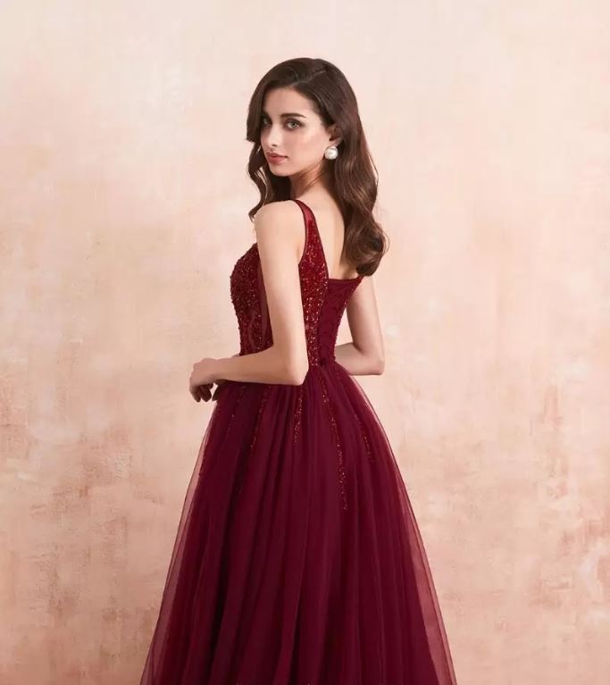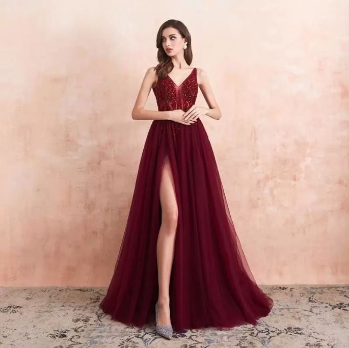 Party Dresses Elegant Long Burgundy Beaded Eveing Sheer V-neck High Slit Vestido Novia Sencillo Prom Homecoming Grown