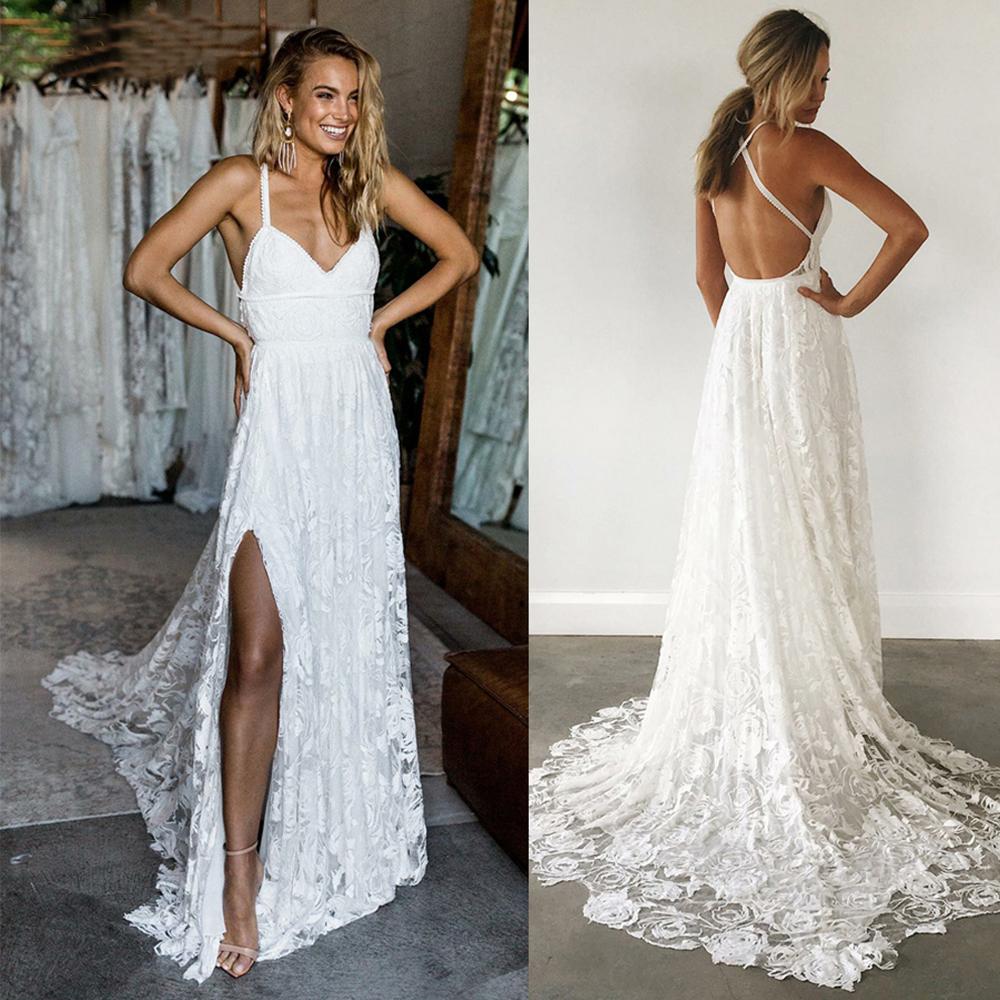 Sexy Boho Wedding Dresses Beach Lace Elegant Long Train Side Split Backless Spaghetti Straps Bridal Gowns