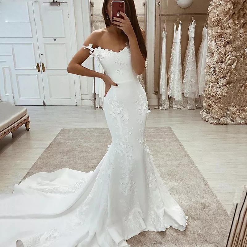 White Satin Wedding Dresses 3D-Floral Appliques Mermaid Bridal Gowns