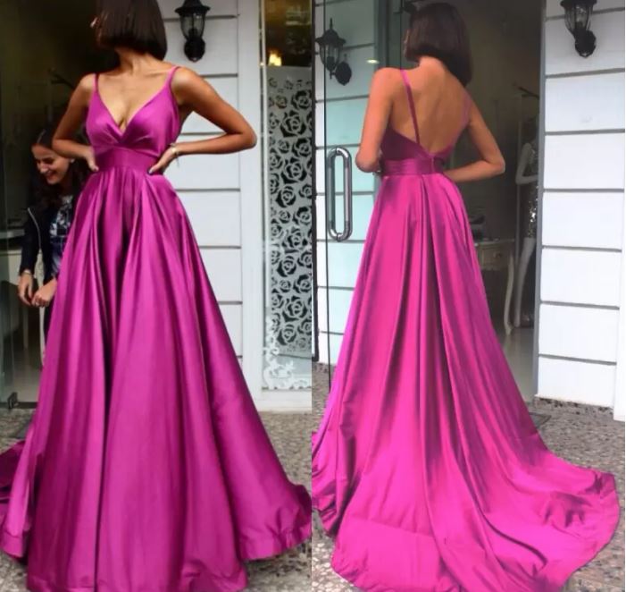 Deep V-Neck Prom Party Dresses Sexy Sleeveless Zipper Backless Satin Sweep Train Evening Gowns