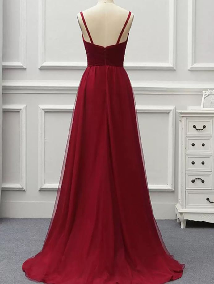 Sexy Straps Spaghetti Women Dark Red Prom Dresses Soft Tulle Hi-Lo Train Formal Evening Gowns
