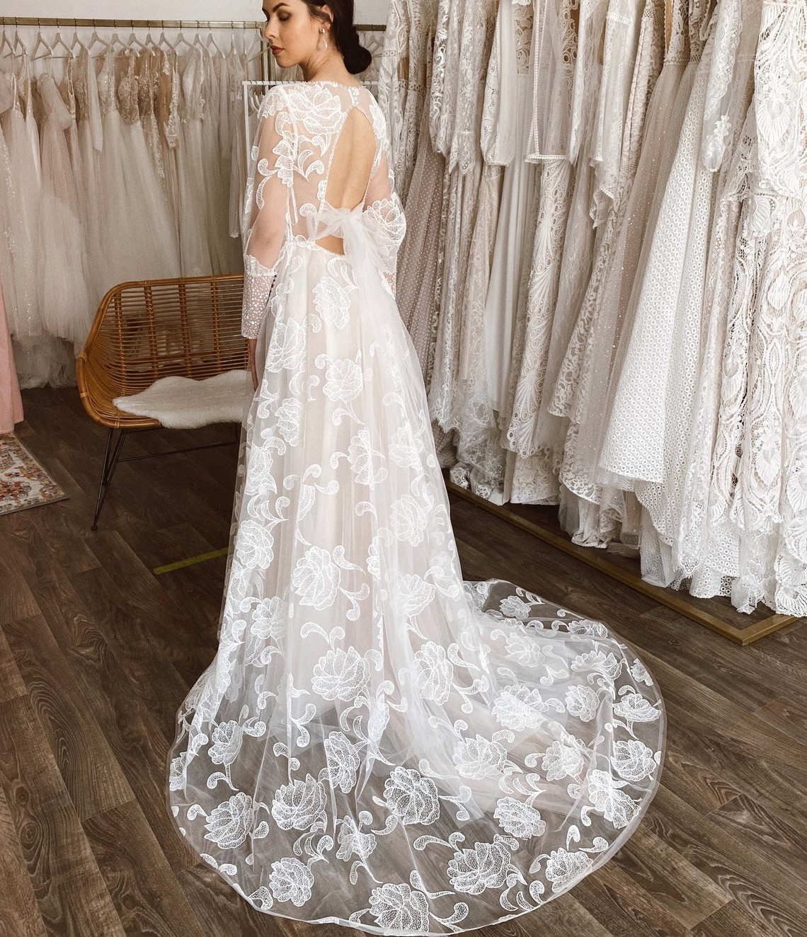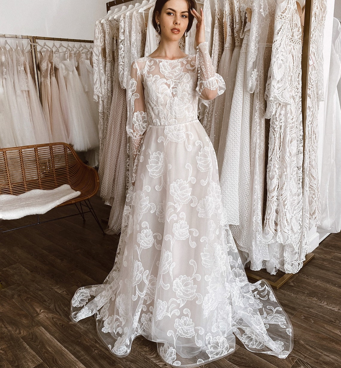 Elegant Long Sleeve Chiffon Boat Neck Boho Simple Lace A-Line Sweep Train Wedding Dress
