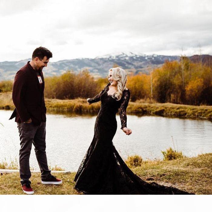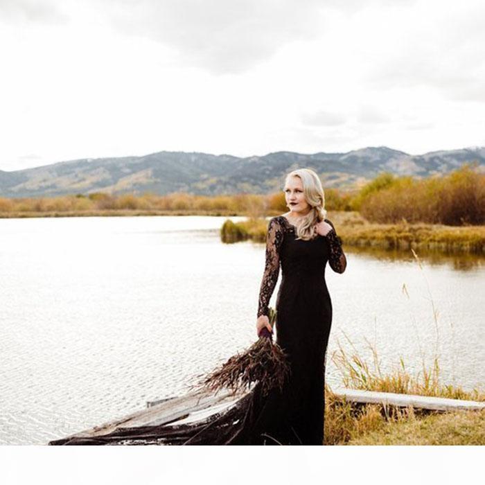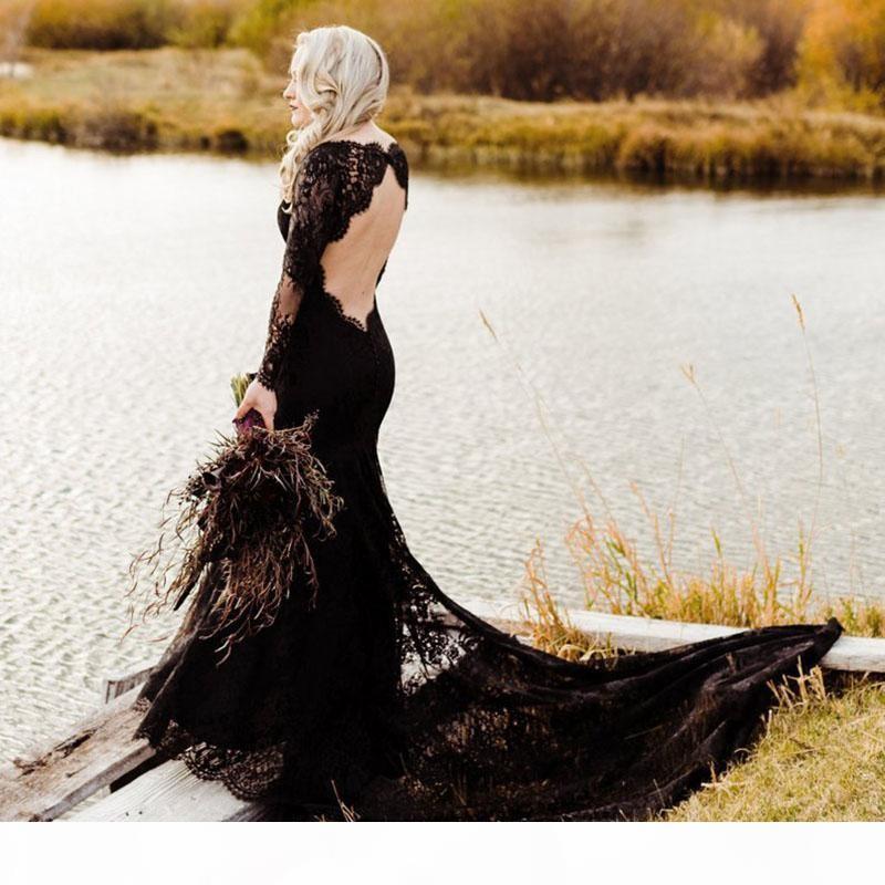 Vintage Black Gothic Mermaid Wedding Dresses Long Sleeves Lace Boho Open Back Bohemian Country Wedding Gowns Bridal Gowns