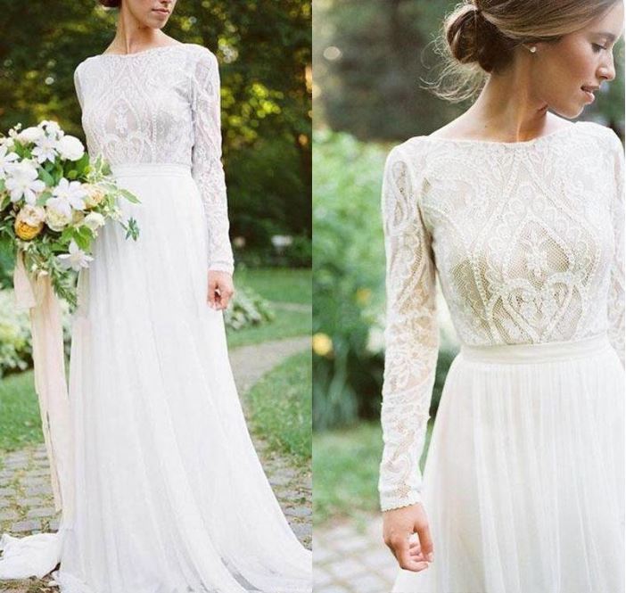 Simple Bohemian Country Wedding Dresses With Long Sleeves Bateau Neck A Line Lace Applique Chiffon Boho Bridal Gowns