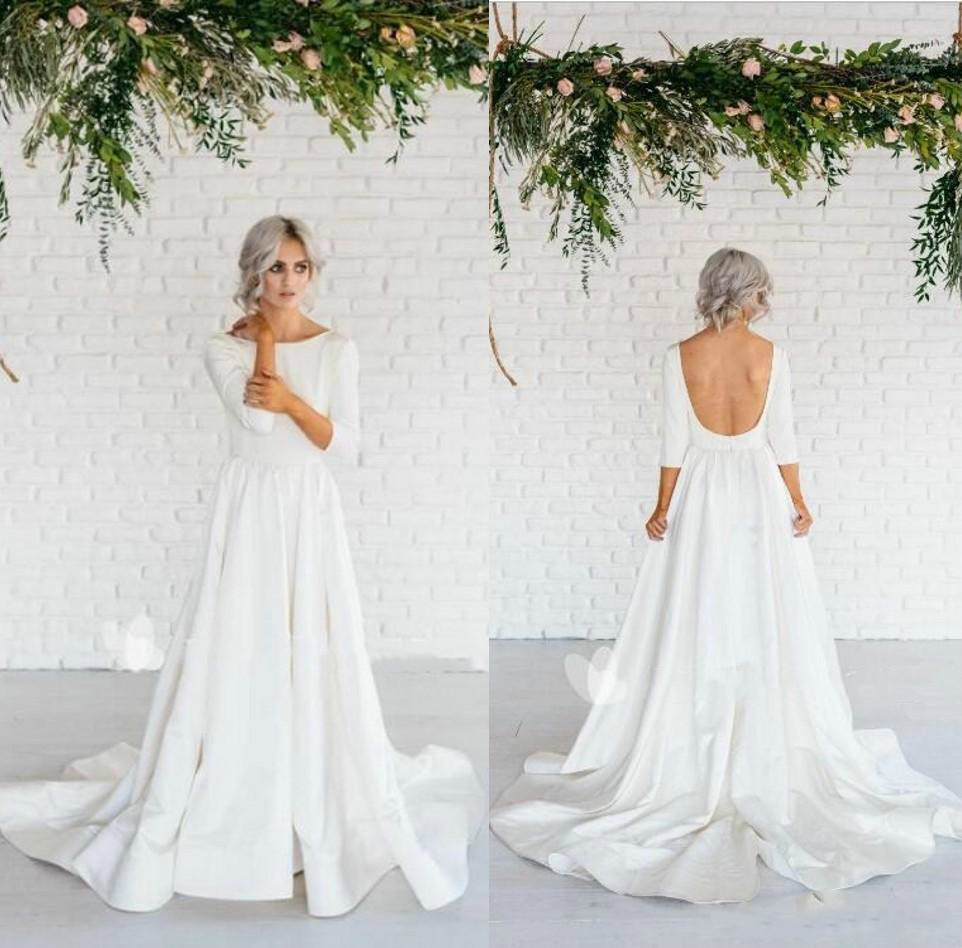 Simple Boho A Line Wedding Dresses Scoop Neck Backless 3/4 Long Sleeve Satin Beach Wedding Dress Bridal Gowns