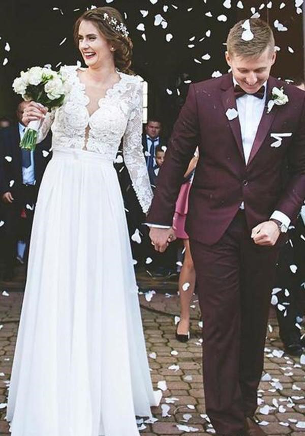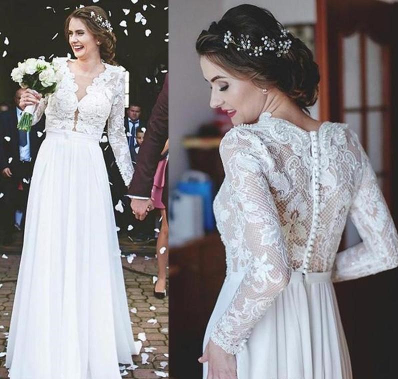 Gorgeous A Line Country Wedding Dresses Cheap Chiffon Lace Appliques Beaded Bride Dress V Neck Long Sleeves Vintage Beach Boho Bridal Gowns