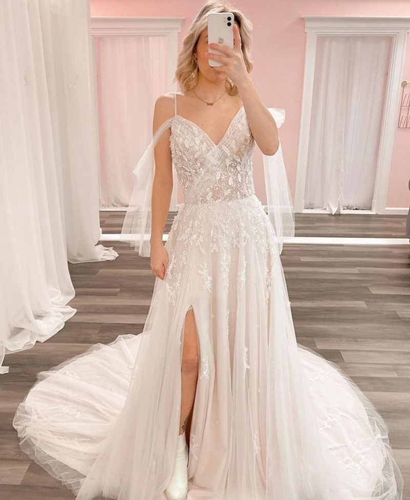 Spaghetti Straps Princess Wedding Dresses V-neck Lace Boho Bride Dresses Side Split Wedding Gowns