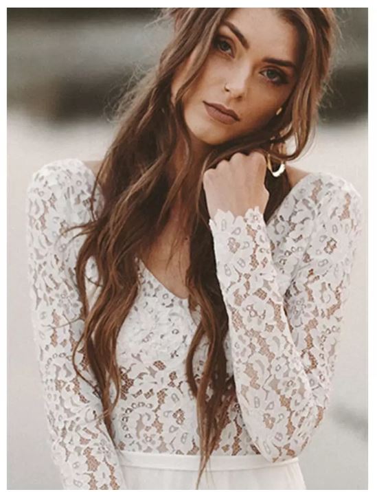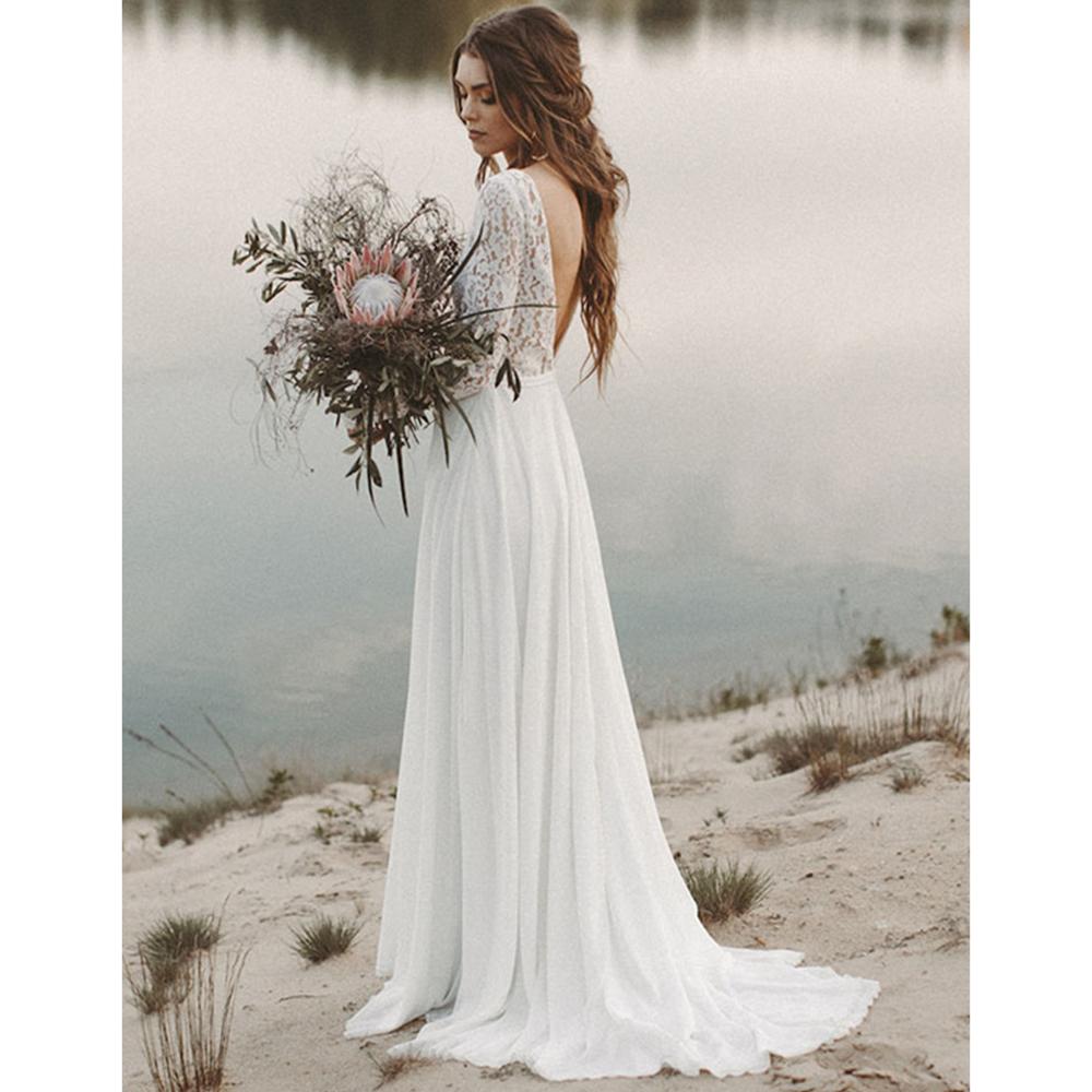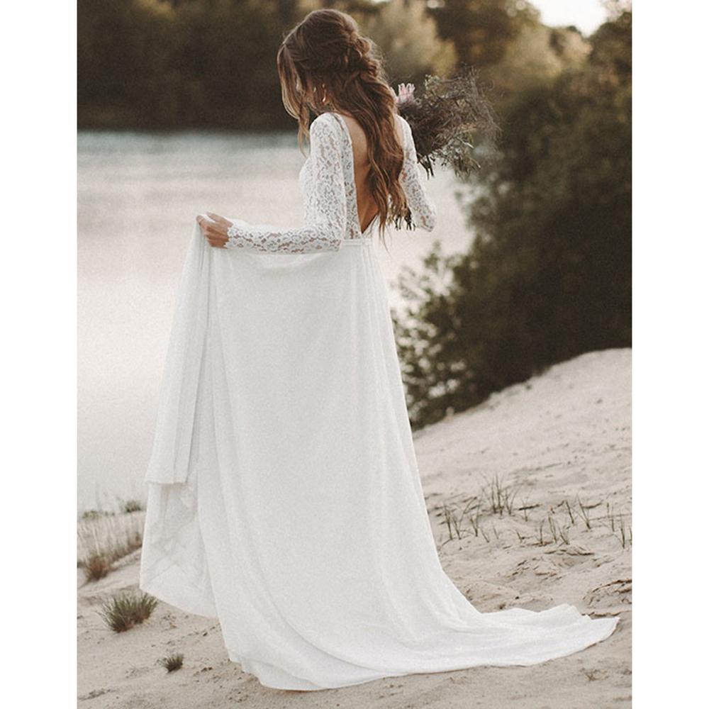 Bohemian V-Neck Chiffon Wedding Gowns Summer Lace Top Sexy Backless Full Sleeves Bride Long Wedding Dresses