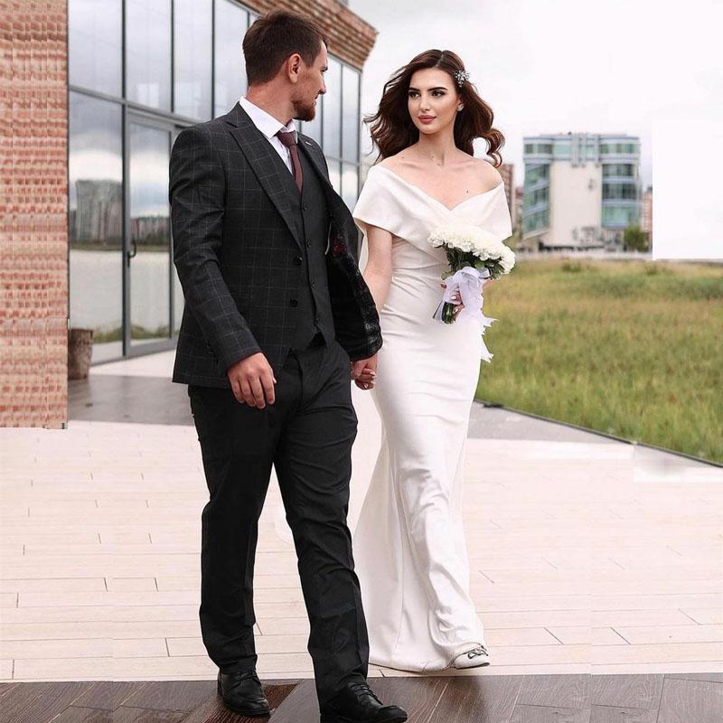Capped Satin Wedding Dresses V Neck Sheath Garden Bridal Gowns