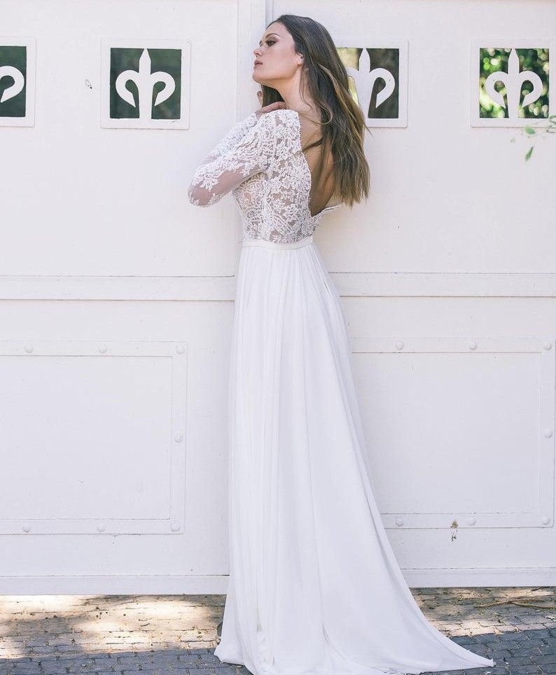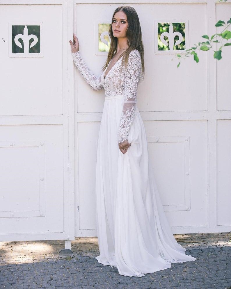 Sexy Open Back Lace Long Sleeves Country Bohemian Wedding Dress Cheap Vinatge Deep V Necl Lace Top Chiffon Beach Boho Bridal Gown