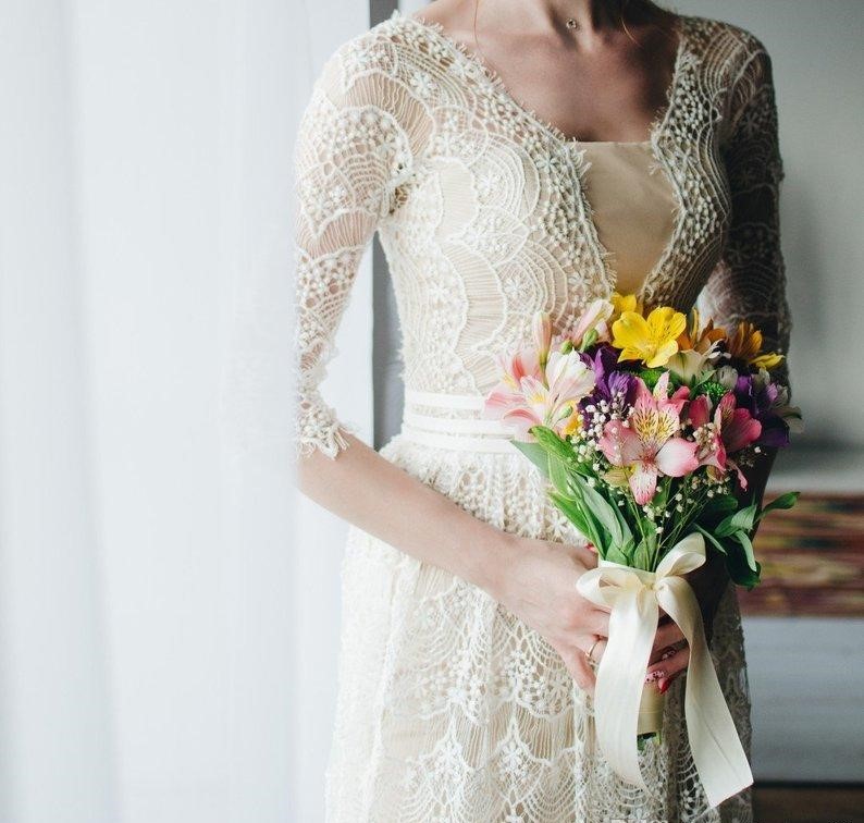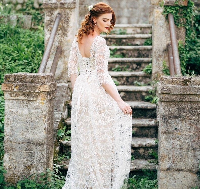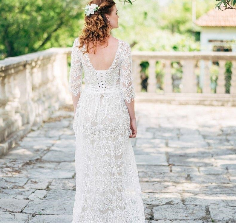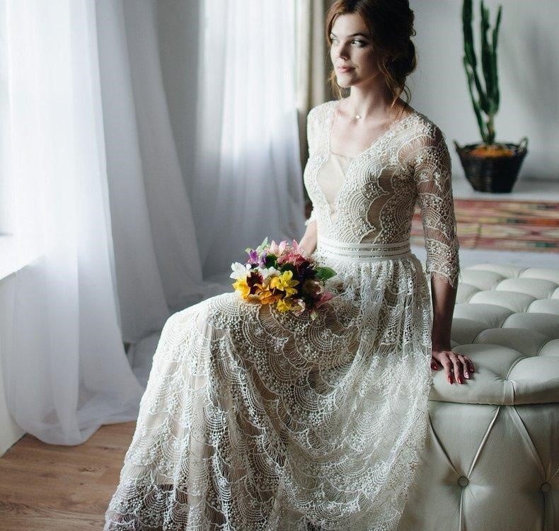 Bohemian Beach Wedding Dresses Lace Appliqued V Neck 3/4 Long Sleeve Wedding Dress Plus Size Beach Bridal Gowns