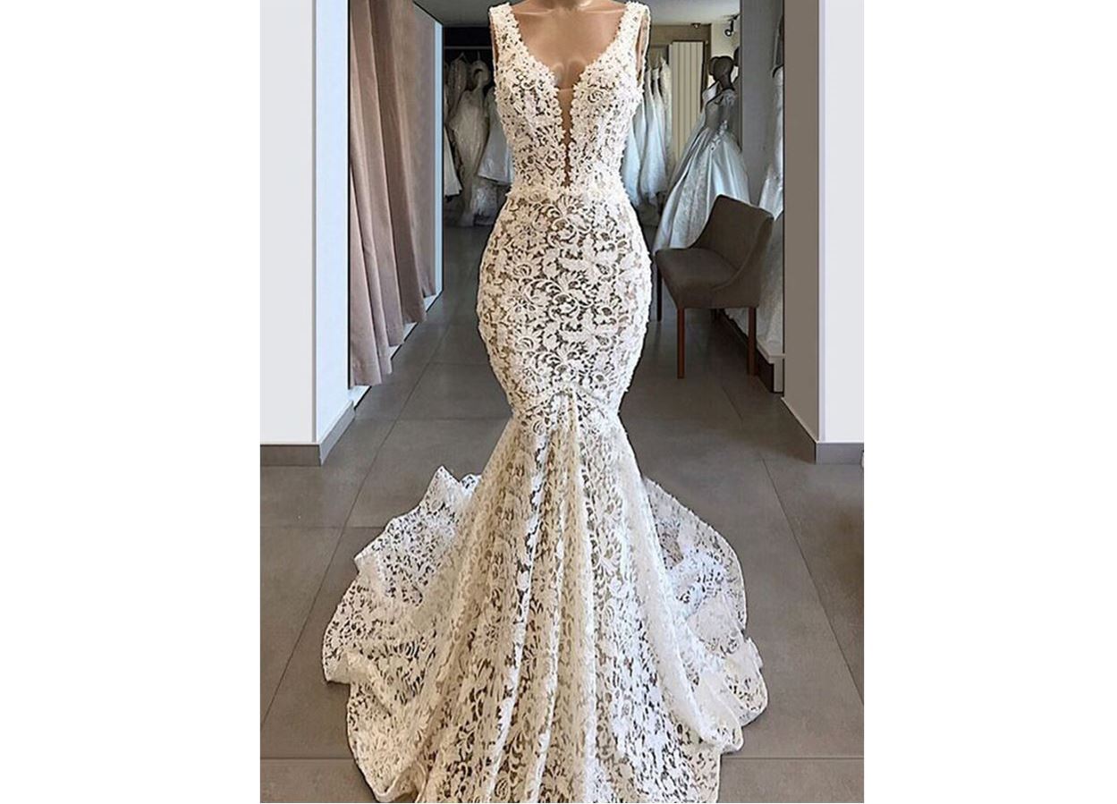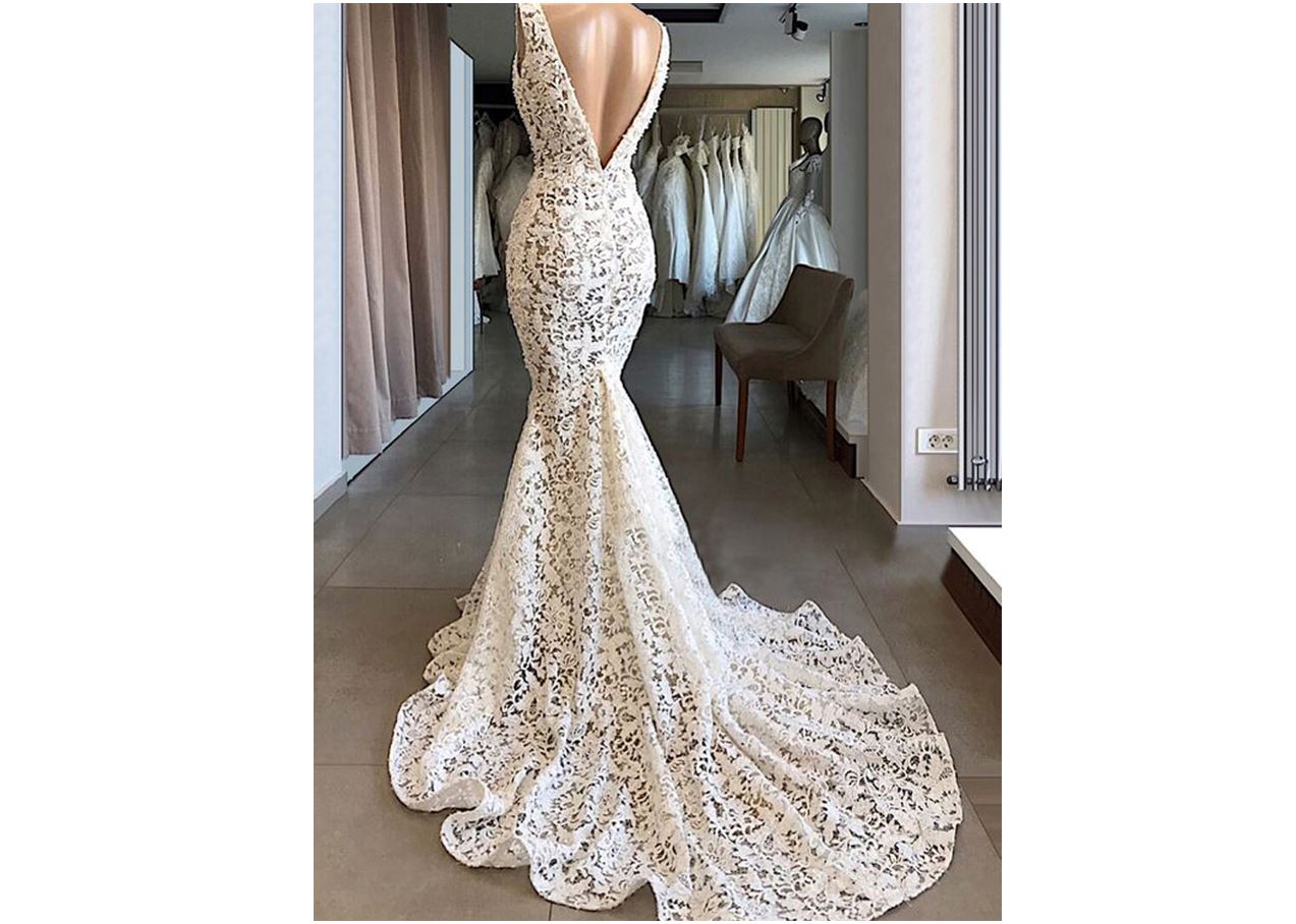 Charming Mermaid V Neck Open Back Ivory Lace Wedding Dresses