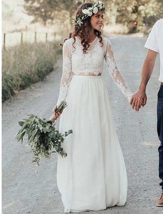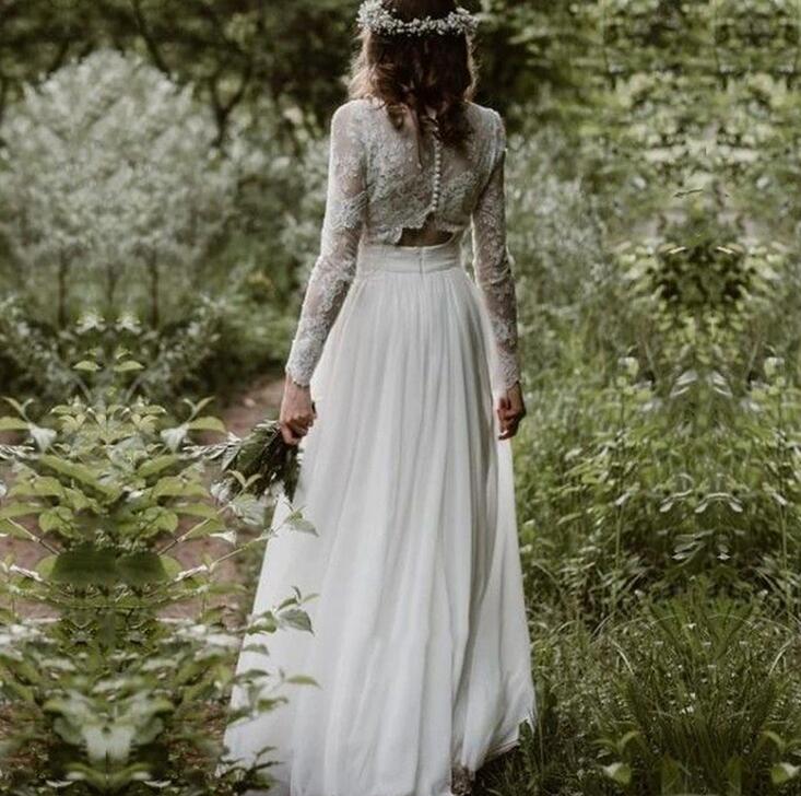 Two Piece Wedding Dress O-Neck Long Sleeves Lace Wedding Gown Bohemian Bridal Dress