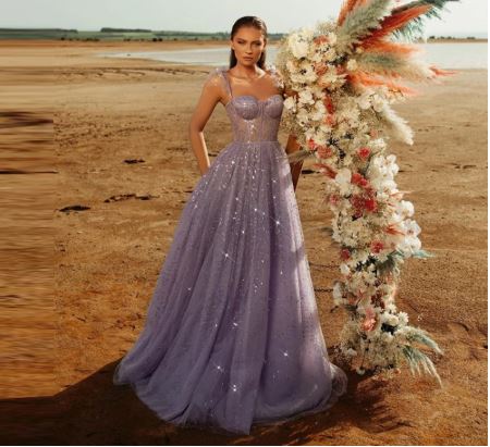 Elegant Lavender Glitter Long Prom Dresses Straps Tied Sweetheart Corset A Line Evening Gowns