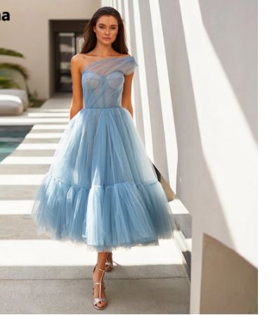 Simple Blue Tulle Midi Prom Dresses One Shoulder Tea-Length A-Line Wedding Party Dresses